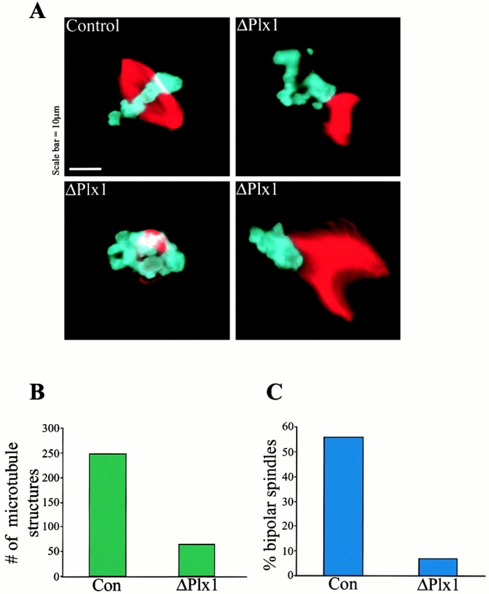 Figure 6. Plx1 depletion causes defects in microtubule polymerization and spindle assembly. (A) Representative microtubule structures found in control- and Plx1-depleted extracts. (B) Quantification of spindle defects showing the decrease in total microtubule structures formed in Plx1-depleted (ΔPlx1, 64) compared with IgG-depleted (Con, 247), and (C) the small percentage of normal bipolar spindles formed in Plx1-depleted extract. A total of 933 structures were counted in three separate experiments.