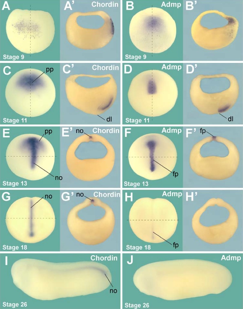 Figure S1. Comparative Expression of Admp and Chordin during Early Xenopus Development. (A and A' Chordin expression is first detected in superficial cells at the blastula stage in a dorso-animal domain (which spans animal cap and marginal zone cells) corresponding to the BCNE (Blastula Chordin and Noggin Expressing) Center (Kuroda et al., 2004). The BCNE center gives rise to brain, floor plate and notochord at later stages of development. The dotted line indicates the direction of the section shown in the right panel. (B and B Admp expression is detected at stage 9 in a similar dorso-animal domain, but in cells located deeper than the ones expressing Chordin. (C and C At stage 11, expression of Chordin expands and is seen in involuted cells of the future prechordal plate (pp) and midline. (D and D At a similar stage, Admp is also expressed locally in involuting cells of the prospective midline, but in a narrower and more posterior domain than that of Chordin. (E and E At stage 13, Chordin is expressed in a broad domain within the prechordal plate (pp) and in notochord (no). (F and F Admp expression at stage 13 is localized to the floor plate (fp), a superficial layer of midline cells overlying the notochord. (G and G Expression of Chordin at early neurula stage persists in the notochord (no) and is turned off in the prechordal plate. (H and H At early neurula stage, Admp expression fades and is seen only in the posterior-most region of the floor plate. (I and J) At tadpole stage, Chordin expression is restricted to the posterior notochord, while expression of Admp is no longer detectable. |