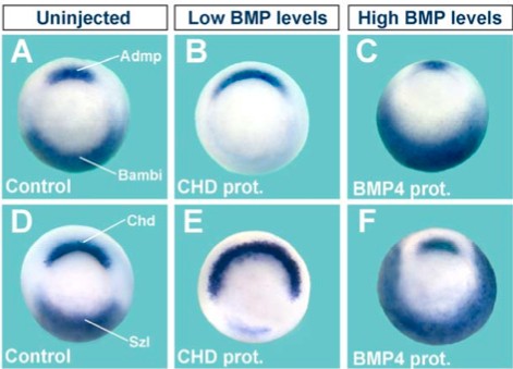 Genes referenced: acvr1 admp alk bambi bmp2 bmp4 chrd egr2 en2 krt12.4 myod1 nog otx2 rax six3 smad1 sox2 sptssb szl tbx2 tll1 tll2 twsg1 ventx1