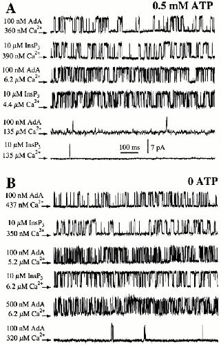Figure 2. Typical single-channel current traces of X-InsP3R-1 in various [Ca2+]i, activated by InsP3 or AdA as indicated. Arrows indicate the closed channel current levels. (A) In the presence of 0.5 mM ATP. (B) In the absence of ATP.