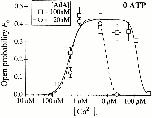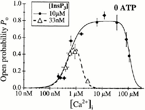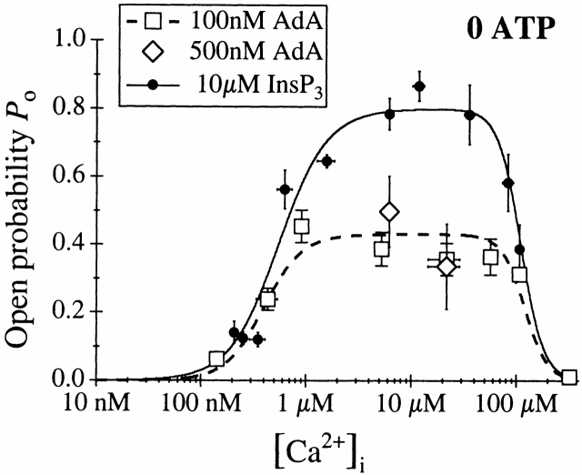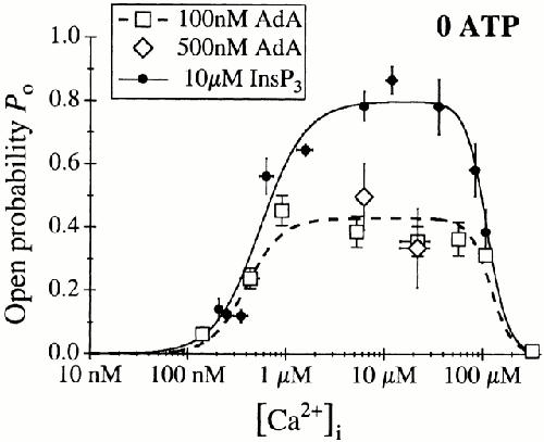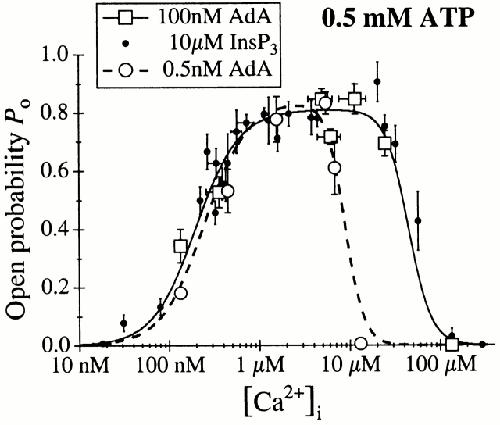 Figure 3. [Ca2+]i dependence of the Po of the X-InsP3R-1 channel in the presence of 0.5 mM ATP, activated by AdA or InsP3 (Mak and Foskett 1998). The solid and dashed curves are theoretical fits by the Hill equation () of the Po data from [AdA] = 100 nM and 0.5 nM, respectively.