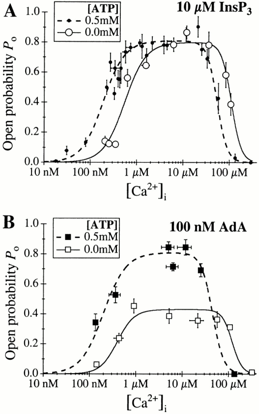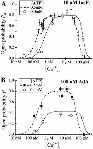 Figure 5. [Ca2+]i dependence of the Po of the X-InsP3R-1 channel activated by saturating concentrations of ligands in the presence or absence of ATP. (A) 10 μM InsP3; (B) 100 nM AdA. The solid and dashed curves are theoretical fits by the Hill equation () of the data in 0 or 0.5 mM of ATP, respectively.
