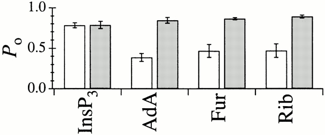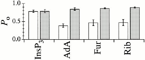 Figure 9. Po of the X-InsP3R-1 channel in optimal [Ca2+]i (4.4–6.2 μM) and saturating concentrations of various ligands in 0 (white bars) and 0.5 mM (shaded bars) ATP.