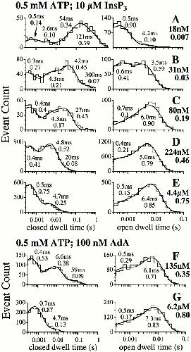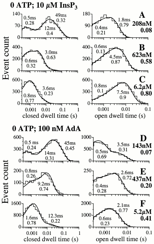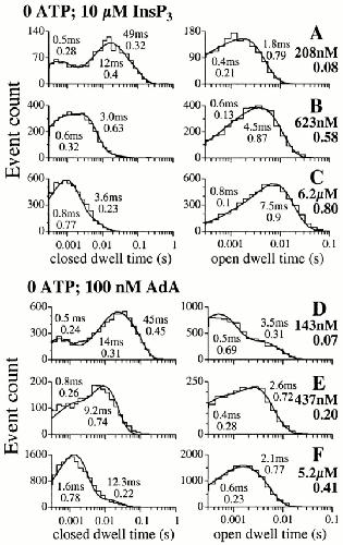 Figure 12. Open and closed dwell time histograms of the X-InsP3R-1 channel in the absence of ATP and various [Ca2+]i, activated by saturating concentrations of InsP3 (10 μM) or AdA (100 nM). The smooth curves are the pdf. The time constant and relative weight of each exponential component of the pdf are tabulated next to the corresponding peak in the curves. [Ca2+]i used in each of the analyzed experiments and its Po are tabulated next to the corresponding graphs.