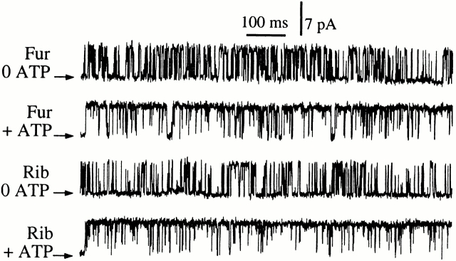Figure 8. Typical single-channel current traces of the X-InsP3R-1 activated by 10 μM Fur or Rib. In 0.5 mM ATP (+ ATP), [Ca2+]i = 5.0 μM. In the absence of ATP (0 ATP), [Ca2+]i = 6.2 μM. The arrows indicate the closed channel current levels.