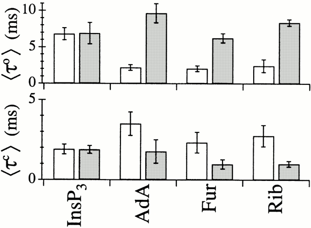 Figure 13. 〈τc〉 and 〈τo〉 of X-InsP3R-1 channels in optimal [Ca2+]i (4.4–6.2 μM) and saturating concentrations of various ligands in 0 (white bars) and 0.5 mM (shaded bars) ATP.