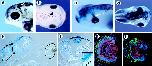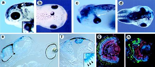 Overexpression of Xfz3 promotes ectopic eye formation and causes proximaleye defects. (a) Stage 42 embryo showing an ectopic eye in the dorsal head region (white arrow). (Inset) A higher magnification view of the ectopic eye. (b) Stage 45 embryo with an ectopic eye in the dorsal midline of the head. (c) Stage 42 embryo showing streaming of the retinal pigment epithelium from the endogenous eye toward the midline. (d) Stage 45 embryo with abnormally positioned eye on the injected side, marked with β-galactosidase (blue). (e) Section through an embryo similar to the one shown in d, showing the eye adjacent to the neural tube on the injected side (Left). (f) Section through a stage 45 embryo, showing an ectopic eye in the roof of the fourth ventricle that is fully labeled with the tracer β-galactosidase (blue). (Inset) A high-magnification view from an adjacent section, showing a row of morphologically distinct photoreceptor outer segments in the ectopic eye (arrowheads). (g and h) Immunolabeling of a section through a normal eye (g) and ectopic eye (h) with anti-Pax6 antibodies (red) and anti-rhodopsin antibodies (green). Nuclei are labeled with Hoechst (blue). The ectopic eye in h shows an arrangement of retinal layers similar to that in the normal eye in g.