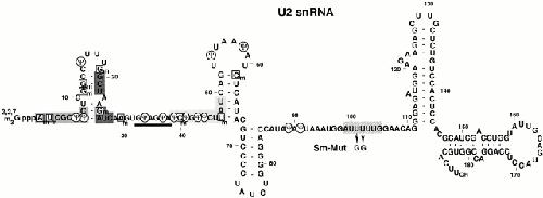 Figure 1. Primary and secondary structure of Xenopus U2 snRNA. Internal modified nucleotides are highlighted by circles (pseudouridines) and squares (2â²-O-methylated residues). The Sm binding site is indicated by a hatched gray box. Sequences known or predicted to be involved in intermolecular interactions are indicated: the thick line denotes bases interacting with the branch site of pre-mRNA; sequences boxed in dark gray, medium gray, and light gray are involved in U2-U6 interactions called Helix I, Helix II, and Helix III, respectively (Nilsen 1998). The arrows indicate mutations introduced into the Sm binding site (Sm-Mut). |