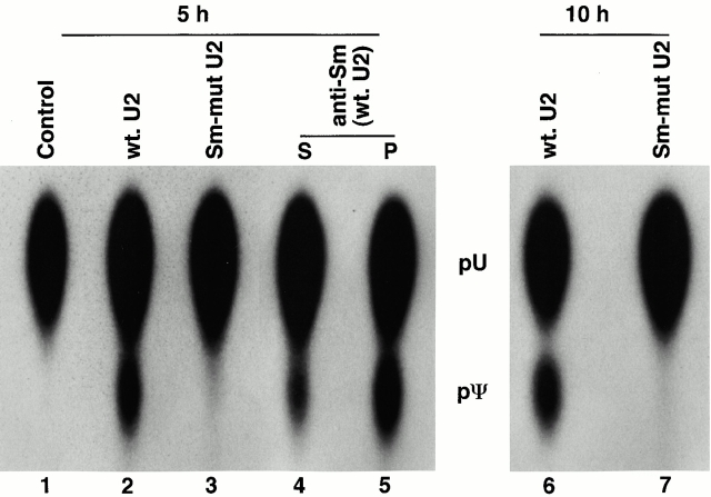 Figure 3. Binding of Sm proteins is required for U2 internal modification. [α32P]UTP uniformly labeled wild-type (lanes 2, 4, 5, and 6) or Sm-mutant U2 (lanes 3 and 7; see Fig. 1) was injected into isolated nuclei under oil. After 5 h (lanes 1â5) or 10 h (lanes 6 and 7) at room temperature, RNAs were recovered by phenol-chloroform-isoamylalcohol extraction and ethanol precipitation and subjected to the pseudouridylation assay (lanes 1â3, 6, and 7). For the wild-type U2, â¼40% (lane 2, 5 h) or 50% (lane 6, 10 h) of the expected level of modification was observed. Alternatively, wild-type U2 was recovered by anti-Sm (Y-12 antibody) immunoprecipitation after 5 h at room temperature and then subjected to the pseudouridylation assay (lanes 4 and 5). More than 85% of the expected level of modification was observed in immunoprecipitated RNA (lane 5). S, supernatant; P, pellet. The control is an uninjected U2 RNA. |