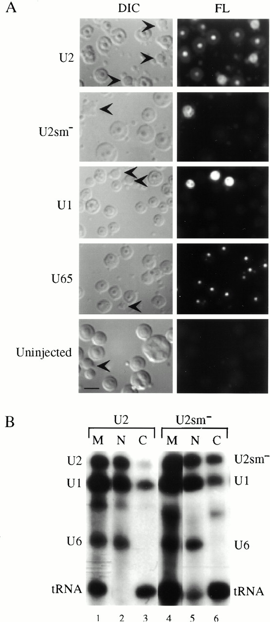 Figure 4. (A) Intranuclear localization of wild-type U2 and Sm-mutant U2 (U2smâ) snRNAs. 1 fmol of 32P- and fluorescently labeled, in vitroâtranscribed U2, Sm-mutant U2, U1, or U65 was injected into Xenopus oocyte nuclei. Nuclear spreads were prepared 5 h later. U1 was included as a positive control for Cajal body localization and as a negative control for nucleolar localization (Narayanan et al. 1999). U65 snoRNA served as a positive control for nucleolar localization and as a negative control for Cajal body localization (Narayanan et al. 1999). A nuclear spread prepared from an uninjected oocyte was included to control for background fluorescence of the preparations. The nuclear spreads were analyzed by DIC and fluorescence (FL) microscopy. Each panel includes several nucleoli and a few Cajal bodies. Cajal bodies are indicated by arrowheads in the DIC panels. (B) Nucleocytoplasmic distribution of U2 and Sm-mutant U2 (U2smâ) snRNAs. Injected oocytes from the same batch analyzed above were dissected into nuclear and cytoplasmic fractions after 5 h. Samples were analyzed by denaturing PAGE and autoradiography to determine the stability and nucleocytoplasmic distribution of the injected RNAs. tRNA was used as a positive control for export and U6 served as a nuclear retention control (Narayanan et al. 1999; Speckmann et al. 1999). Nuclear (N) RNAs are in lanes 2 and 5, cytoplasmic (C) RNAs are in lanes 3 and 6, and marker (M) lanes 1 and 4 show RNAs before injection. Bar, 10 μm. |
