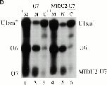 Figure 5. Introduction of a snoRNA nucleolar localization signal restores internal modification of Sm-mutant U2. (A) Structures of the wild-type U2-C/D motif chimera, the Sm-mutant U2-C/D motif chimera, the 5â² 1/2U2-C/D motif chimera, the 3â² 1/2U2-C/D motif chimera, and the 5â² 1/2U2-C/DÎC motif chimera, each containing a nucleolar localization signal derived from U14 snoRNA (box C, box D, and a short terminal stem), are shown schematically. The two arrows in the Sm-mutant U2-C/D chimera depict the double point mutation in the Sm binding site. The two arrows in 5â² 1/2U2-C/DÎC indicate the sequence alterations in box C. (B) [α32P]UTP uniformly labeled wild-type U2-C/D motif chimera (lane 2), Sm-mutant U2-C/D motif chimera (lane 3), 5â² 1/2U2-C/D motif chimera (lane 4), 3â² 1/2U2-C/D motif chimera (lane 5), or 5â² 1/2U2-C/DÎC motif chimera (lane 6) was injected into isolated nuclei under oil. 5 h later, RNAs were recovered and assayed for modification. 40â50% of the calculated level of modification was observed in lanes 2â4. The positions of uridylate and pseudouridylate are indicated. |