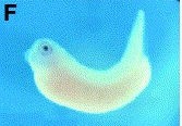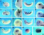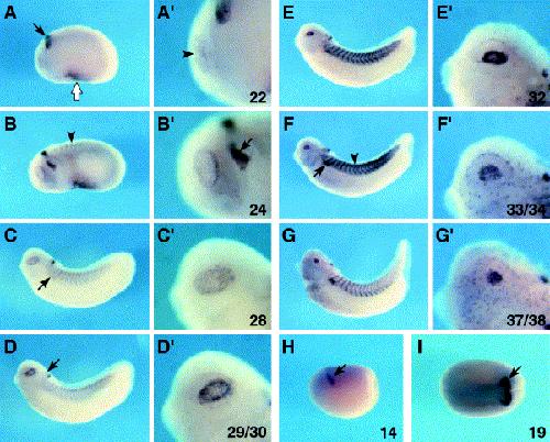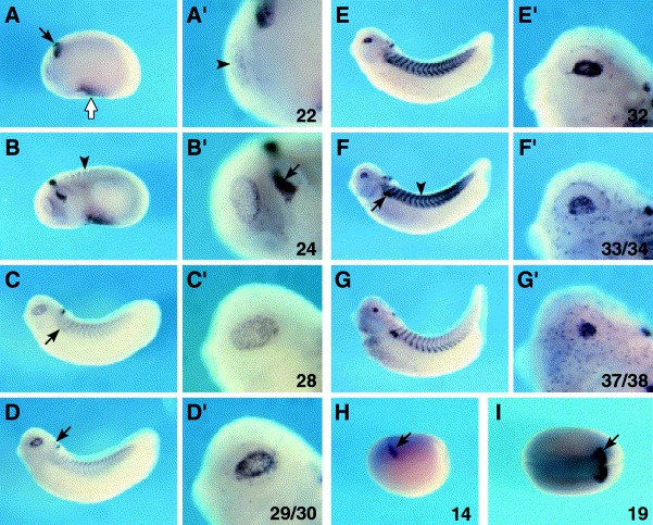 Fig. 2. Whole-mount in situ hybridization showing expression domains of XmafB. (AâH) Lateral view of whole embryos. (Aâ²âGâ²) High magnification of the eye showing XmafB expression (AâG). (A,Aâ²) At stage 22 XmafB is expressed in rhombomeres (r) 5 and 6 (black arrow), the presumptive blood island (white arrow) and lens-forming ectoderm (arrowhead). (B,Bâ²) At stage 24 signal appears in somites (arrowhead) and neural crest cells (arrow). (C,Câ²) Stage 28. Staining is detected in the developing pronephros (arrow) and lens placode. (D,Dâ²) The expression in r4 becomes detectable at stage 29/30 (arrow). (E,Eâ²) Stage 32. (F,Fâ²) Stage 33/34. Strong staining is detected in somites (arrowhead) and pronephros (arrow). (G,Gâ²) Stage 37/38. The lens is stained. (H) XmafB is initially expressed in the anteriorneuroectoderm at stage 14 (arrow). (I) Dorsal view of stage 19 embryo. Signal is found in r5 and 6 (arrow).