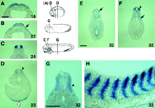 Fig. 3. Sections of embryos analyzed by whole-mount in situ hybridization for XmafB expression. (AâG) Sectioning planes are indicated in schematic diagrams. (A) At stage 14 XmafB is expressed in the anteriorneuroectoderm. (B) At stage 22, signal also appears in neural crest cells (arrow). (C) Stage 24. Staining is observed in the dorsal part of the neural tube. (D) Section of stage-23 embryo at the level of the trunk showing XmafB expression in somite (arrowhead) and blood island (white arrow). (EâH) Stage 32. (E) Section at the level of rhombomere (r) 4. Bilateral staining is seen in the dorsal part of the neural tube (arrow). (F) Section through r5 and pronephros. Expression of XmafB is found in the dorsal part of the neural tube (arrowhead) and developing pronephros (arrow). (G) Section at the level of the trunk showing XmafB expression in somite (arrowhead). (H) Parasagittal section shows myotomal cells are stained. Scale bars: 200 μm.
