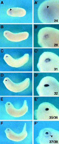 Fig. 4. Whole-mount in situ hybridization showing the expression of XL-maf. (AâF) Lateral view of whole embryos. (Aâ²âFâ²) High magnification of the eye showing XL-maf expression (AâF). (A,Aâ²) At stage 24 XL-maf is initially expressed in the PLE (arrowhead). (B,Bâ²) At stage 28 staining is detected in lens placode. (C,Câ²) Stage 31. (D,Dâ²) Stage 32. Strong signal in developing lens placode is found. (E,Eâ²) Stage 35/36. XL-maf is expressed in lens detached from ectoderm. (F,Fâ²) At stage 37/38 signal also appears in retina (arrowhead).