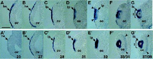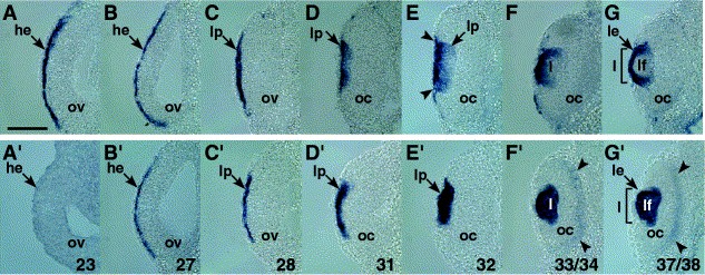 Fig. 5. Transverse sections through the level of the eye showing expression of XmafB (AâG) and XL-maf (Aâ²âGâ²) during lens formation, after whole-mount in situ hybridization. (A,Aâ²) At stage 23 expression of XmafB is found in the sensorial layer of the ectoderm, but not XL-maf. (B,Bâ²) Both genes are expressed in the sensorial layer which is beginning to thicken at stage 27. (C,Câ²) Stage 28. (D,Dâ²) At stage 31 signals are detected in the developing lens placode. (E,Eâ²) At stage 32 XmafB is detectable in the border between the ectoderm and lens placode, while XL-maf can be detected in the prospective lens fiber cells of the placode. (F,Fâ²) Stage 33/34. XL-maf is also expressed in the prospective neural retina (arrows). (G,Gâ²) Subsequently expression of XmafB is found in lensepithelium, and that of XL-maf in lens fiber cells at stage 37/38. he, headectoderm; l, lens; le, lensepithelium; lf, lens fiber cells; lp, lens placode; oc, optic cup; ov, optic vesicle. Scale bars: 100 μm.
