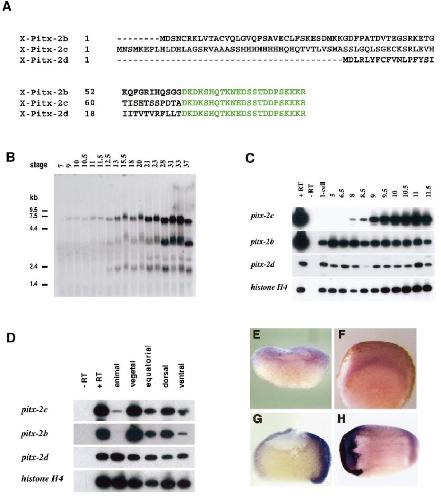 results were obtained with a probe containing the coding region. (C) RT-PCR analysis showing that in Xenopus, pitx2b, and pitx2d are