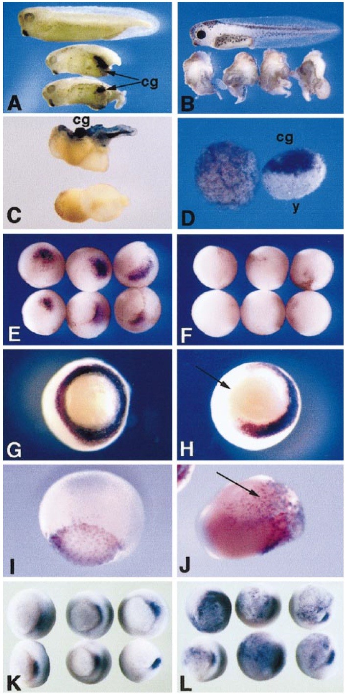 occurred, gastrulation was prevented, and no dorsal or anterior structures have developed. (E–L) EnR-pitx2 RNA was injected into various