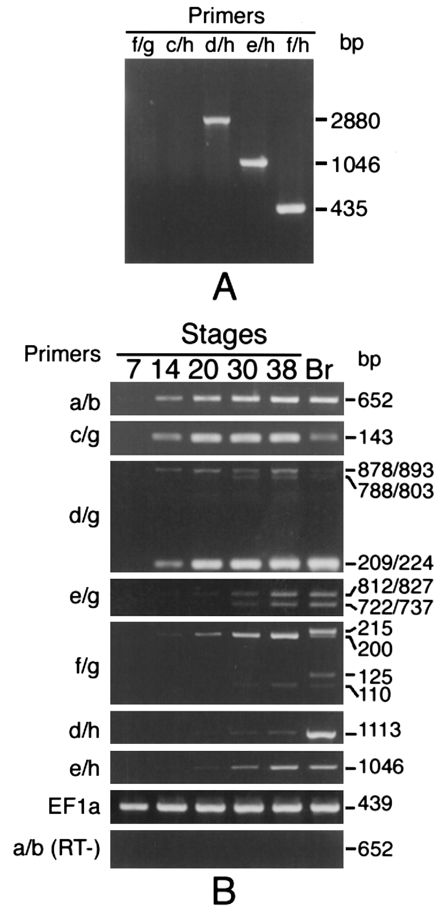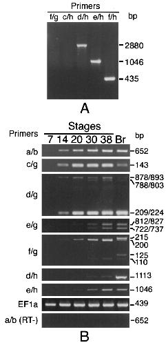 Fig. 3. (A) Genomic PCR of the XRPTPβ sequence. Genomic DNA was isolated from blood cells and XRPTPβ sequences were amplified with primer combinations indicated. The products were analyzed by electrophoresis on a 0.8% agarose gel. (B) RT-PCR analysis of the different forms of XRPTPβ. Total RNA fractions were isolated from adult brains (Br) and whole embryos at the indicated developmental stages, and used as templates for reverse transcription. EF1α was amplified as a positive control. As a control for reverse transcription (RT-), the reaction was performed without the reverse transcriptase.