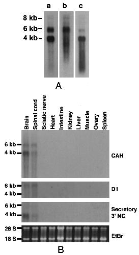 Fig. 4. Northern blot analysis of XRPTPβ expression. (A) The blot of poly (A)+ RNA from adult brains (5 μg) was sequentially hybridized with CAH (a), D1 (b) and sXRPTPβ-specific 3â²-non-coding (NC; c) probes. Positions of the RNA size marker (Novagen) are indicated on the left. (B) The blot of total RNA fractions (20 μg) from various tissues was sequentially hybridized with the probes indicated. The ethidium bromide (EtBr)-stained gel is for loading control.