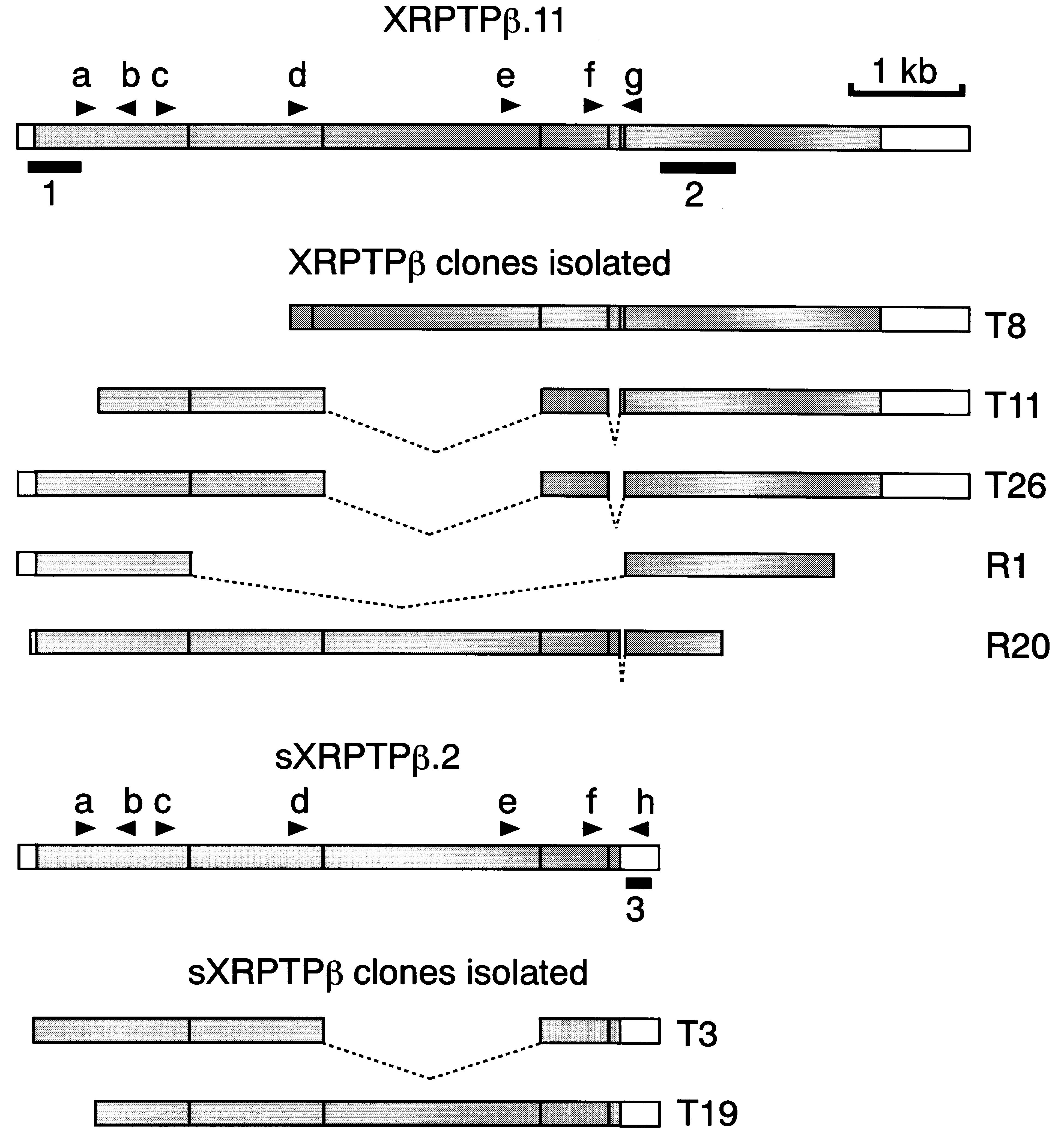 Fig. 1. Structure of the representative XRPTPβ clones and two cDNAs encoding the largest receptor (XRPTPβ.11) and phosphacan (sXRPTPβ.2). The gray boxes represent coding sequences and the open boxes, 5′- and 3′-noncoding sequences. The dotted lines indicate deletion of the DNA segments in between. The clones T8, T11 and T26, and R1 and R20 were isolated using D1/D2 probes (see Section 3.1) from the oligo (dT)-primed and random-primed cDNA libraries, respectively. The clones T3 and T19 were isolated using a fragment of R1 encoding the CAH/FN III sequence. Each clone partially encodes XRPTPβ.1 (R1), XRPTPβ.4 (T26), XRPTPβ.5 (T11), XRPTPβ.10 (R20), XRPTPβ.11 (T8), sXRPTPβ.1 (T3) and sXRPTPβ.2 (T19), respectively (see Table 1). The thick bars 1–3 indicate the sequences used as probes for Northern blot analysis (see Fig. 3), and the arrowheads a–h, positions of the oligonucleotide primers (see Section 2.2).
