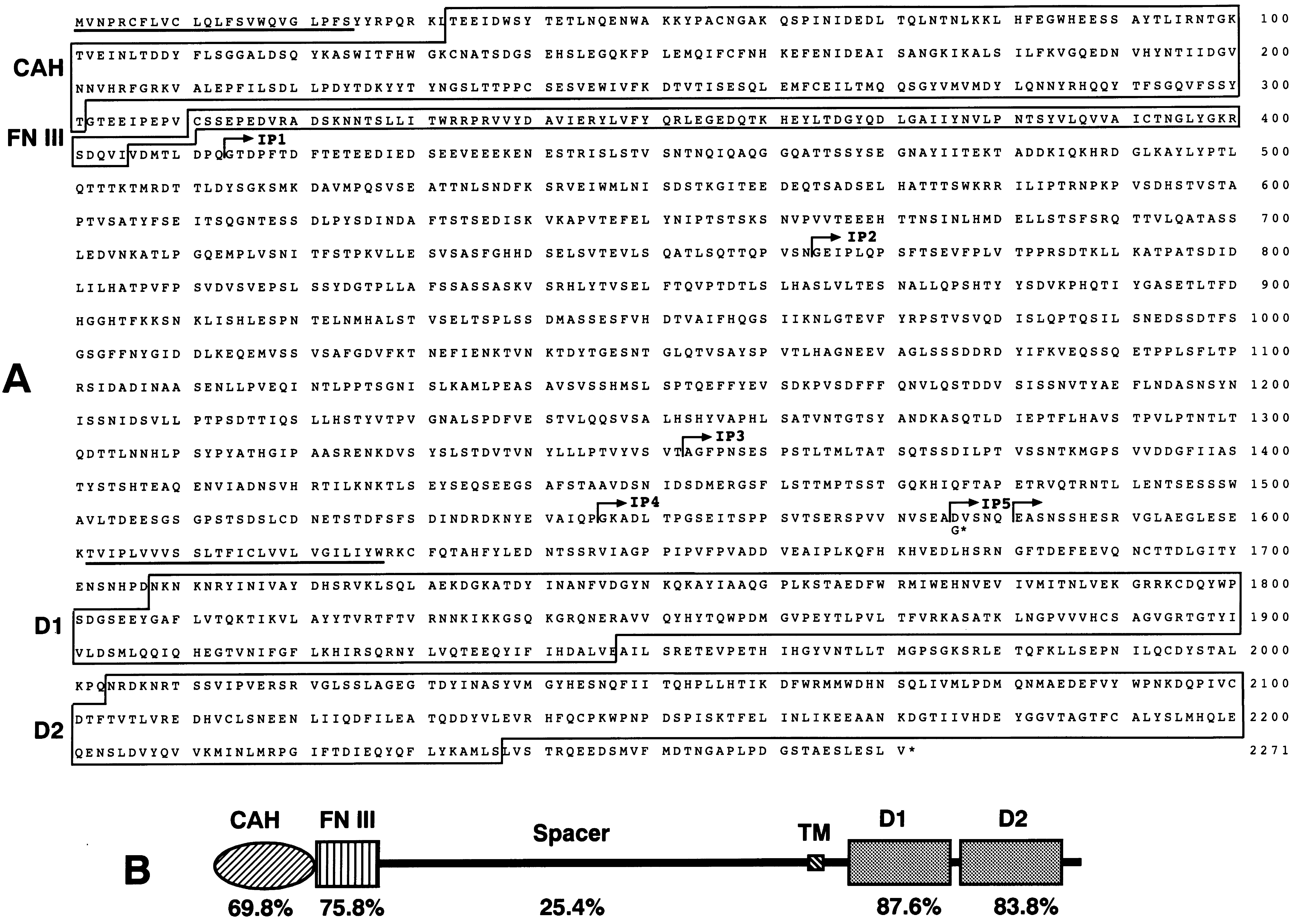Fig. 2. (A) The aa sequences of XRPPβ.11 and sXRPTPβ.2. The hydrophobic signal peptide (aa 1–24) and the transmembrane peptide (aa 1602–1627) are underlined. The CAH domain (aa 33–301), the FN III domain (aa 311–404), and the two phosphatase domains, D1 and D2 (aa 1708–1948 and aa 2004–2237, respectively) are boxed. Arrows represent the boundaries of IP 1–IP 5. In sXRPTPβ.2, a single glycine (G) is substituted for the sequence following to the residue 1575, which results in deletion of the transmembrane and intracytoplasmic sequences. The complete nt sequences of XRPPβ.11 and sXRPTPβ.2 have been deposited in the DDBJ/GeneBank/EMBLE database (accession No. AB045237 and AB045238). (B) Comparison of the aa sequences of XRPTPβ.11 and human RPTPβ. Percentage of identical aa residues is shown for each domain.