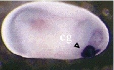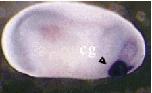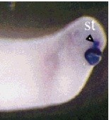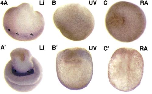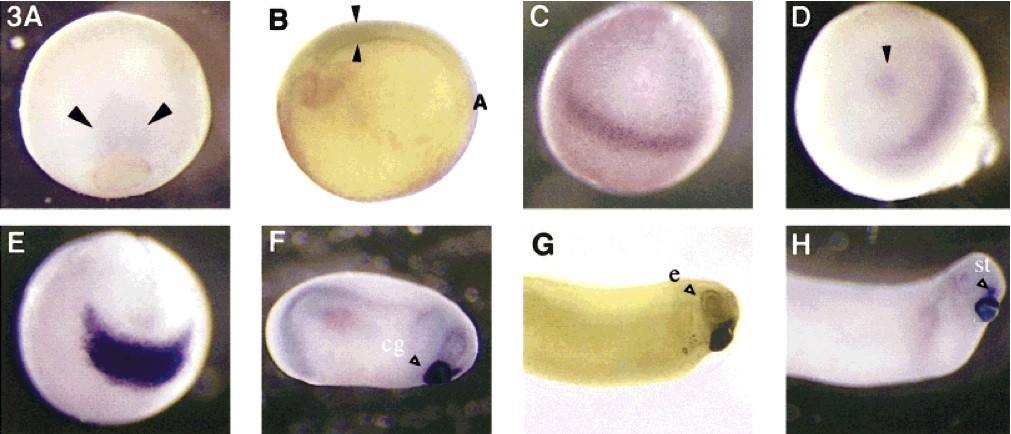 Xenopus Pitx1 is a homeobox gene whose family members are structurally and functionally conserved in organisms as diverse as Drosophila, chick, mouse, human, and frog. Present as a maternal transcript, the gene is zygotically expressed during gastrulation in a dorsal streak of cells. This streak restricts to a small circular domain underlying the center of presumptive neural plate. Shortly thereafter, a crescent of expression develops at the border of anterior neural ectoderm, and as the central plate domain diminishes, the crescent coalesces to define the presumptive cement gland. Expression remains high throughout cement gland development, and subsequently expands to include ectodermal cells involved in stomodeal invagination. During early organogenesis, expression ensues in developing eye, posterior lateral mesoderm, and first branchial arch derivatives. Ectopic expression of xPitx1 causes head deformities including enlarged cement gland, ectopic cement glands, and posterior deformities or, in extreme cases, inhibition of recognizable structures posterior to the cement gland. Expression of markers such as XCG-1, xOtx2, xPax6, neuralbeta tubulin, and xTwist suggest that increases in cement gland and lower mandibular size are likely at the expense of other head tissues. Paradoxically, overexpression is sufficient to partially rescue embryos that are axially perturbed by ultraviolet irradiation or retinoic acid administration. Ectopic expression of xPitx1 in ectodermal explants directly promotes cement gland development as there was no evidence that mesodermal or neural tissue was present in explants.