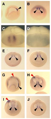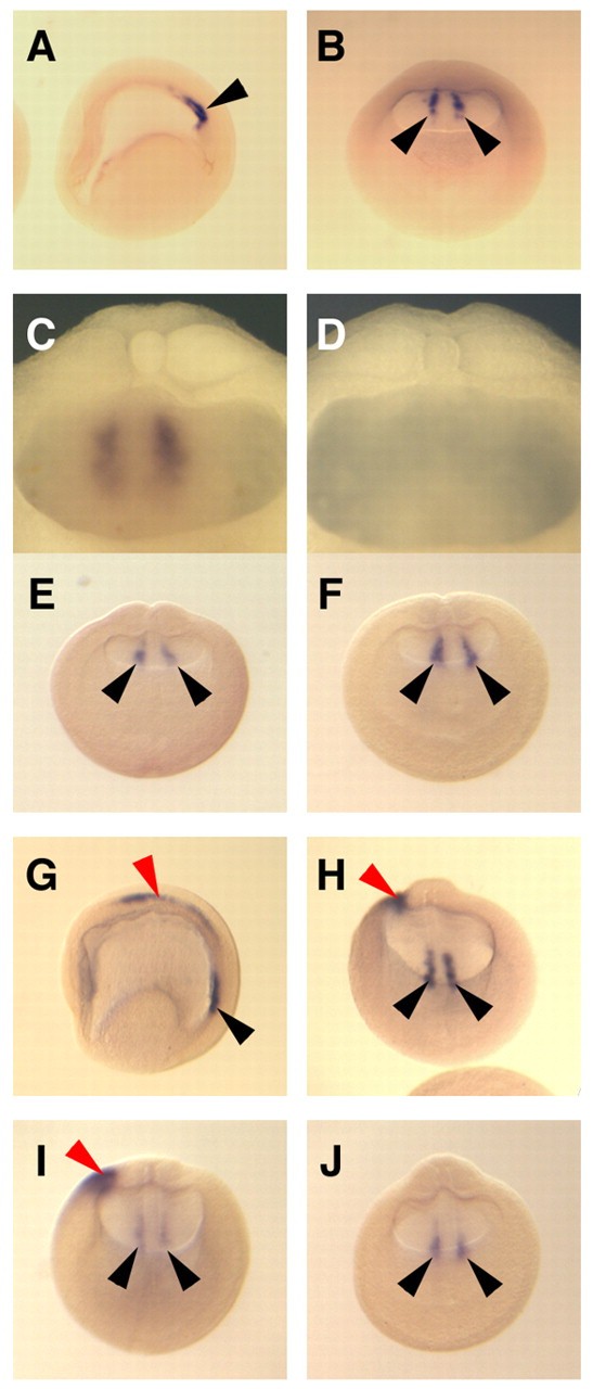 Fig. 7. Bilateral expression of XNR1 is not affected by XCR2 MO injection. (A-C) Normal expression pattern of XNR1 in the posterior archenteron roof at stage 15 as determined by in situ hybridization using uninjected embryos. Asymmetric expression of XNR1 was not observed at stage 15. (C) Posterior archenteron roof of half-dissected embryo in side view. Two stripes of bilateral XNR1 expression were observed. (D) In situ hybridization with an XNR1 sense probe. No signal was observed in the archenteron roof. (E,F) Injection of 20 ng of SC MO (E) or of XCR2 MO (F) into the marginal region of both blastomeres at the two-cell stage. The bilateral expression of XNR1 is not affected at stage 15 in either condition. (G,H) Normal expression pattern of XNR1 at stage 20. The bilateral expression is maintained (black arrowheads) and asymmetric expression appears in the LPM (red arrowhead). (I) Injection of 20 ng of SC MO does not inhibit either bilateral or asymmetric expression of XNR1 at stage 20. (J) Injection of 20 ng of XCR2 MO inhibited the asymmetric expression of XNR1, but not bilateral expression at stage 20. (A,G) Lateral views. The anterior side is to the left. (B,E,F,H-J) Posterior views. The dorsal side is up. The embryo was cleared with benzyl benzoate/benzyl alcohol (A,B,E-J). Black arrowheads indicate the bilateral expression of XNR1; red arrowheads indicate the asymmetric expression of XNR1. |