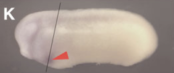 nodal1 ( nodal homolog 1) gene expression in a bisected Xenopus laevis embryo, assayed via in situ hybridization, NF stage 20, dorsal left. |