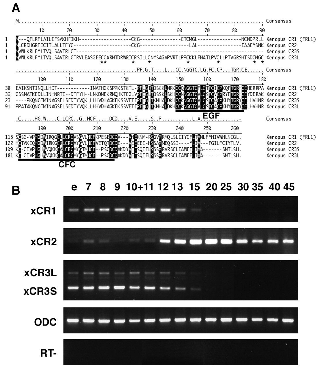 Fig. 1. Comparison of amino acid sequences and temporal expression patterns of Xenopus EGF-CFC factors. (A) Comparison of the amino acid sequences of Xenopus EGF-CFC proteins (XCR1, XCR2, XCR3S and XCR3L). XCR3L has a 72 amino acid insertion following the signal sequence of XCR3S. Dash indicates no amino acid present. Identical residues are shadowed. Conserved EGF-like domains and CFC domains are underlined. Cysteine residues in the additional 72 amino acids of XCR3L are indicated by asterisks. (B) Temporal expression patterns of Xenopus EGF-CFC genes (XCR1, XCR2, XCR3S and XCR3L) detected by RT-PCR. RNA was extracted from embryos at the stages indicated over each lane. XCR3S (lower band) and XCR3L (upper band) were detected using a set of primers designed to span the insert region. Both bands showed a similar temporal expression pattern. e, un-fertilized egg; RT-, RT-PCR reaction without reverse transcriptase. |