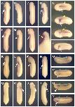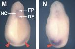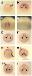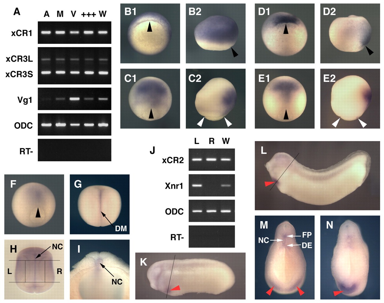Fig. 2. Spatial expression patterns of Xenopus EGF-CFC genes. (A) Spatial expression patterns of XCR1, XCR3S and XCR3L at stage 9, as determined by RT-PCR of the animal region (A), the marginal region (M), the vegetal region (V), a mixture of the dissected three parts (+++) and intact whole embryos (W). VG1 was used as a control for dissection. (B-I,K-N) Spatial expression analyses by in situ hybridization for XCR1 (FRL1; B,C), XCR3 (D,E) and XCR2 (F-I,K-N). (B1,D1) Stage 10+ in vegetal view. The dorsal side is up. (C1,E1,F,G) Stage 12 (C,E,F) and stage 15 (G) in dorsal view. The anterior side is up. (B2,C2,D2,E2) Stage 10+ (B,D) and stage 12 (C,E) in lateral view. The anterior side is up and the dorsal side is to the right. (H) Stage 20 in dorsal view. Embryo was cleared with benzyl benzoate/benzyl alcohol. Lines show the left (L) and right (R) dissection model for RT-PCR (J). (I) Transverse bisected embryo at stage 20. (J) RT-PCR of the left lateral region (L), the right lateral region (R) and intact whole embryos (W) at stage 20. XCR2 was expressed bilaterally, whereas XNR1 was expressed on only the left side. (K) Stage 25. Line indicates the section plane shown in M. (L) Stage 30. Line indicates the section plane in N. (M,N) Transverse cut embryos at stage 25 (M) and stage 30 (N). Red arrowheads indicate the expression of XCR2 in the prospective heart region; black arrowheads indicate the dorsal lip; white arrowheads indicate the blastopore. DE, dorsal endoderm; DM, dorsal midline; FP, floorplate; NC, notochord. |