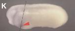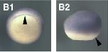 tdgf1.3 (teratocarcinoma-derived growth factor 1, member 3) gene expression in Xenopus laevis embryo, assayed via in situ hybridization, NF stage 10, blastoporal viw (B1 on left ) and lateral view, anterior right ( B2). |