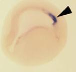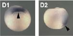 tdgf1.1 (teratocarcinoma-derived growth factor 1, member 1) gene expression in Xenopus laevis embryo, assayed via in situ hybridization, NF stage 12, blastoporal view, dorsal up (D1 left), and lateral view (D2 left). |