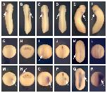 Fig. 8. Right-side overexpression of XCR2 causes left-right inverted gene expression. (A-D,G-I,M-O) In situ hybridization of XNR1 in dorsal view (A-D,G,I,M,O), anterior side at top, and in side view of a half-dissected embryo (H,N). (E,F,J,K,P,Q) In situ hybridization of XATV in ventral view (E,F) and in dorsal view (J-K,P,Q). (L,R) In situ hybridization of XCR2 in dorsal view. (A,G-H) Embryo injected with 40 pg of pCS-EGFP plasmid in the right side. (B,M-R) Embryo injected with 40 pg of pCS-XCR2 into the right side. (A,E) Embryo showing normal expression of XNR1 (A) or XATV (E) in the left LPM (arrow) at stage 25/26. (B,F) Right-side XCR2 overexpression caused right-side expression of XNR1 (B) or XATV (F; arrow), and suppressed the left-side expression at stage 25/26. (C,D) Injection of 40 pg of pCS-XCR2 mEGF (C) or pCS-XCR2 mCFC (D) into the right side did not affect the expression pattern of XNR1 (arrow) at stage 25. (G-L) Embryos injected with pCS-EGFP plasmid in the right side. XNR1 expression was not detected in the LPM at stage 15 (G) and stage 16 (H), but was detectable at stage 20 (I) (arrow). XATV expression was not detected in the LPM at stage 17 (J), but was detectable at stage 23 (K; arrow). XCR2 was expressed broadly at stage 20 (L). (M-R) Embryo injected with pCS-XCR2 plasmid in the right side. XNR1 expression was ectopically expressed in the right LPM at stage 15 (M) and stage 16 (N), in addition to posterior bilateral expression. Strong XNR1 expression was detected on the right side (arrow), but not on the left side at stage 20 (O). Ectopic XATV expression (arrow) was detected in the right LPM at stage 17 (P). XATV expression was detected on the right side (arrow), but not on the left side at stage 23 (Q). Left-side expression of XCR2 was not affected, but very strong expression was detected on the right (injected) side at stage 20 (R). |