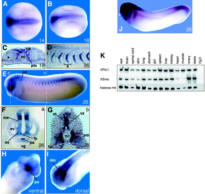 Inductive signaling mediated by secreted factors of the Hedgehog (Hh) gene family regulates cellular proliferation and differentiation in many embryonic tissues. Two transmembrane proteins associated in a complex, Patched (Ptc) and Smoothened (Smo), are indispensable for the reception of Hh signals (Cell 86 (1996) 221; Nature 382 (1996) 547; Nature 384 (1996) 176; Nature 384 (1996) 129). Here, we report on the identification of Ptc and Smo homologues from Xenopus and analyze their spatio-temporal expression during embryogenesis. The intracellular response to Hh signals involves upregulation of Ptc transcription (Genes Dev. 10 (1996) 301; J. Biol. Chem. 271 (1996) 12125). In accordance with its putative function as Shh target gene, XPtc1 expression during early stages of Xenopus embryogenesis is detected in mesodermal and neuroectodermal tissues proximal to the notochord, a known expression domain of Shh. Although the expression pattern of XPtc1 was similar to that of other vertebrates, expression domains specific to Xenopus could be detected in the hypochord, dorsal mesencephalon, otic vesicles and pituitary anlage. Unlike other vertebrate Ptc1 homologues, somitic expression of XPtc1 is confined to a central cell layer. In contrast to the tissue-specific expression characteristics of XPtc1, XSmo expression appears to be ubiquitously activated in early embryonic stages but condenses in the terminal regions of the embryo at tailbud stage. In many tissues and organs of the adult, XPtc1 and XSmo are found to display similar expression levels.