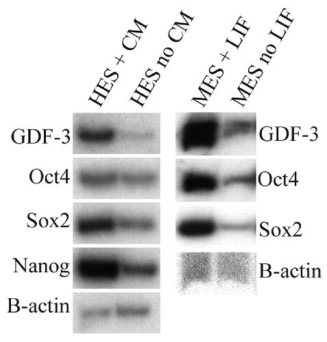 Fig. 1. GDF3 is specifically expressed in the undifferentiated state of embryonic stem cells. (Left panel) RT-PCR of GDF3 expression levels in H1 human embryonic stem cells (HES) in the continued presence (CM) and absence (no CM) of conditioned media for 7 days. (Right panel) GDF3 RT-PCR in 129Ola mouse ES cells in the presence or absence of LIF for 3 days. OCT4, SOX2 and NANOG are markers of pluripotency. β-actin is shown as a loading control; no RT control showed no signal.