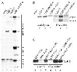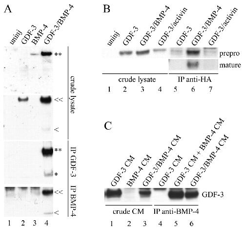 Fig. 3. Immunoprecipitation experiments. (A) Immunoprecipitation of GDF3 and BMP4 from animal caps of frog embryo. First and second panels show 10% crude levels input for immunoprecipitation. Third panel shows immunoprecipitation with FLAG-GDF3, blotted for HA-BMP4; fourth panel shows immunoprecipitation with HA-BMP4, blotted for GDF3. Prepro forms are indicated (**, âª) and mature forms are indicated (*, <). (B) Immunoprecipitation by BMP4-HA or activin-HA using mαHA antibody and blotting with goat αGDF3. The GDF3 prepro (**) form is shown in the upper panel and mature form (*) in the lower panel. (C) Immunoprecipitation of GDF3 by BMP4-HA from CM of COS cells. GDF3 and BMP4 were transfected into separate COS cells (lanes 1,2,4,5) or together in the same COS cells (lanes 3,6). In lane 5, COS CM from separately transfected GDF3 and BMP4 cells was mixed together for the immunoprecipitation. Only the prepro form of GDF3 is shown.