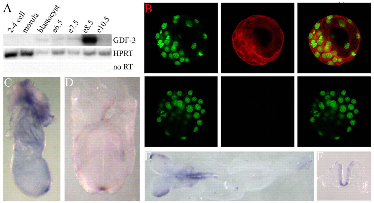 Fig. 6. GDF3 expression during development. (A) RT-PCR of GDF3 throughout early mouse embryo development. HPRT is shown as a loading control and HPRT no RT as a negative control. (B) Immunofluoresence (IF) of GDF3 protein [red (middle)] as detected by goat αGDF3 and counterstained with Sytox Green nuclear stain [green (left)], merged in the right panels. The lower panels show a no primary antibody control. Magnification is 10Ã. (C-F) E7.5 (C), E8.0 (D) and E8.5 (E) embryo in-situ hybridization with GDF3 anti-sense probe. F shows 10-μm sections of whole-mount in-situ hybridizations. In all in-situ experiments, a sense probe showed no specific staining.