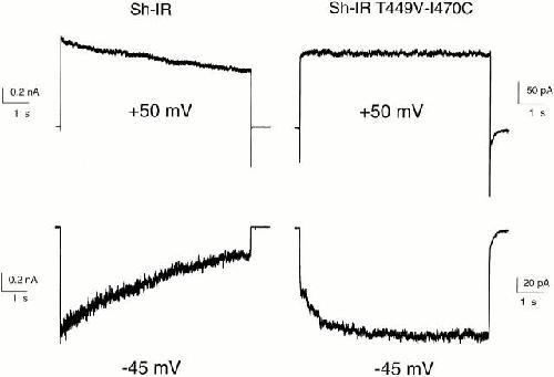 Figure 1. Lack of inactivation in Sh-IR-T449V-I470C macroscopic current. Ionic currents elicited by pulses of 8 s from −90 mV to the indicated potential, in Sh-IR (left) and Sh-IR-T449V-I470C (right). Current records are acquired in the cell-attached patch configuration in symmetric K+ solutions. Note the lack of inactivation and the slow deactivation of the tail currents in Sh-IR-T449V- I470C. |