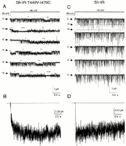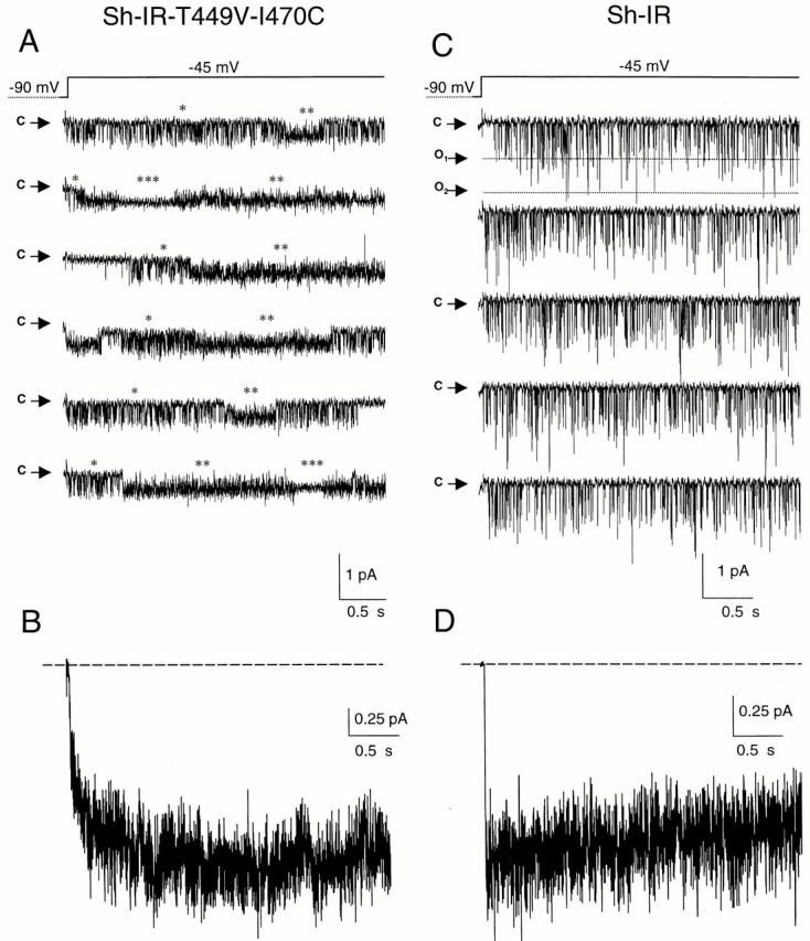 Figure 3. Single channel activity of Sh-IR and Sh-IR-T449V-I470C at −45 mV. (A) Consecutive recordings in a cell-attached configuration (120 mM K+ in bath and patch pipet) from an oocyte expressing Sh-IR-T449V-I470C. The membrane patch contained a single channel. At least three patterns of opening are present: brief openings (Mode 1, *); sustained activity characterized by a higher open probability with some flickering (Mode 2, **); and long openings without flickering (Mode 3, ***). The ensemble average of 30 records from the same patch is shown in B. (C) Single channel activity in Sh-IR at −45 mV; only brief openings are present. The patch contained at least two channels. (D) Ensemble average of 40 records from a patch containing at least four channels, same oocyte as in C. The pulse protocol is shown in the top panels; arrows indicate closed (c) and the open (o) states. |