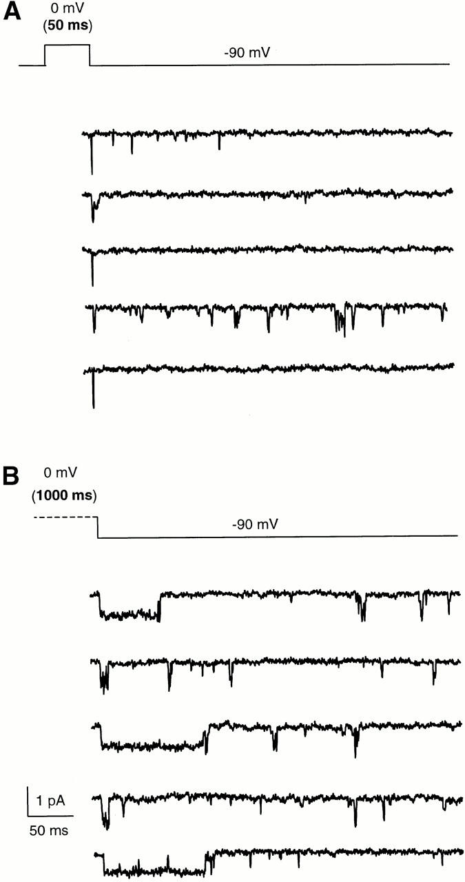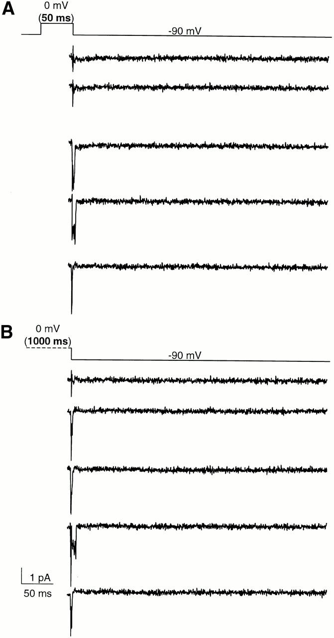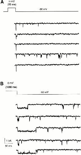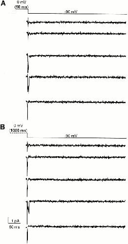 Figure 10. Single channel properties during deactivation in Sh-IR. The records (cell attached patch configuration) show the single channel activity at −90 mV sampled after a depolarization to 0 mV for 50 ms (A) and for 1,000 ms (B). The pulse protocol is shown above the records. Note that during repolarization, the channel activity ceased rapidly when the membrane potential returns to −90 mV for short and long pulses. Currents were sampled at 5 kHz and filtered at 1kHz. |