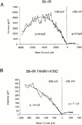 Figure 12. Variance-mean plot in Sh-IR (A) and Sh-IR-T449V-I470C (B). Variance-mean plots taken from an ensemble (n = 201) of current traces recorded in cell attached patch configuration and evoked by 40-ms depolarization to 30 mV, followed by repolarization to −100 mV. Depolarization and repolarization data were fit to the equation: Variance = iI − I2/N, where i represents the single channel current amplitude, I is the mean current, and N is the number of channels; g is the conductance of the single channels. (A and B) are the results for Sh-IR and Sh-IR-T449V-I470C, respectively. The parameters used for the fitting were as follows. Sh-IR at −100 mV, g = 24.0, and POmax 90.2%; at +30 mV, g = 15.8, POmax = 87.3%, and N (at −100 and +30) = 3,538. For Sh-IR-T449V-I470C at −100 mV, g = 8.4, POmax = 42.2%, and N = 2,694; at +30mV, g = 7.1 POmax = 67.0%, and N = 1,380. N was estimated independently for −100 and 30 mV in Sh-IR-T449V-I470C. |