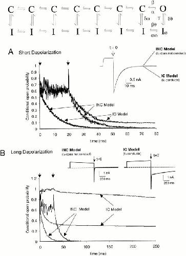 Figure 14. A model for Sh-IR-T449V-I470C. The model is adapted from Olcese et al. 1997, and describes equilibrium properties of slow inactivation in Sh-IR. The rate constants used for the activation pathway were identical to those in Bezanilla et al. 1994. The rate constants leading to and away from the open state (O) are, for the potential −100 mV (in ms−1): α = 11.33, β = 5.23. The voltage independent rate constants of inactivation (γ = 0.00026 ms−1, δ = 4.22 × 10−6 ms−1) and the interaction energy (ln ω = −2.427 kT) are identical to the model of Olcese et al. 1997, except for the additional binding factor θ = 0.01, which was added to slow transitions out of the Io state. (A) Simulated COP decay of tail currents (V = −100 mV) for the case of nonconducting inactivated state (INC), and that of conducting inactivated state (IC), after short depolarizations to 30 mV (20 ms). Two reference times are shown (see arrows) at 0.2 and 20 ms. Data were obtained from 380 groups of 5,000 accumulated runs filtered at 5 kHz, and the COP was computed according to . (B) COP decay after a long depolarization (1 s). Data acquisition is the same as in A, except for filter rate (500 Hz). Reference times (arrows) are 2 and 30 ms. Insets show ionic current for the two models, which are similar for short depolarizations, but diverge for long depolarizations. |