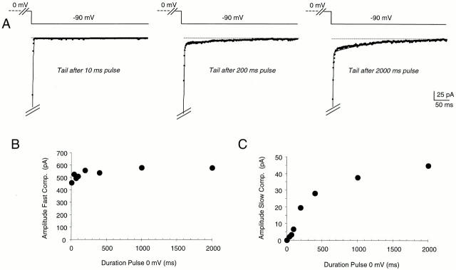 Figure 7. Two components in the tail current of Sh-IR-T449V-I470C. After conditioning depolarization to 0 mV for 0.01, 0.04, 0.07, 0.1, 0.2, 0.4, 1.0, and 2.0 s, the decaying phase of the tail currents at −90 mV were simultaneously fit to the sum of two exponential functions with the constraint that the two time constants were maintained in all traces. (A) Shows tail currents recorded after 10-, 200-, and 2,000-ms pulses to 0 mV with the respective fit superimposed. The fast and slow time constants common to all tail currents were 1.1 and 141.4 ms, respectively. The plot in B shows that the amplitude of the fast component (τ = 1.1 ms) remained practically unchanged with the different pulse duration. On the other hand, the amplitude of the slow component (τ = 141.4 ms; C) increased with the duration of the depolarization, whereas it was practically undetectable for the shortest depolarization (10 ms). |