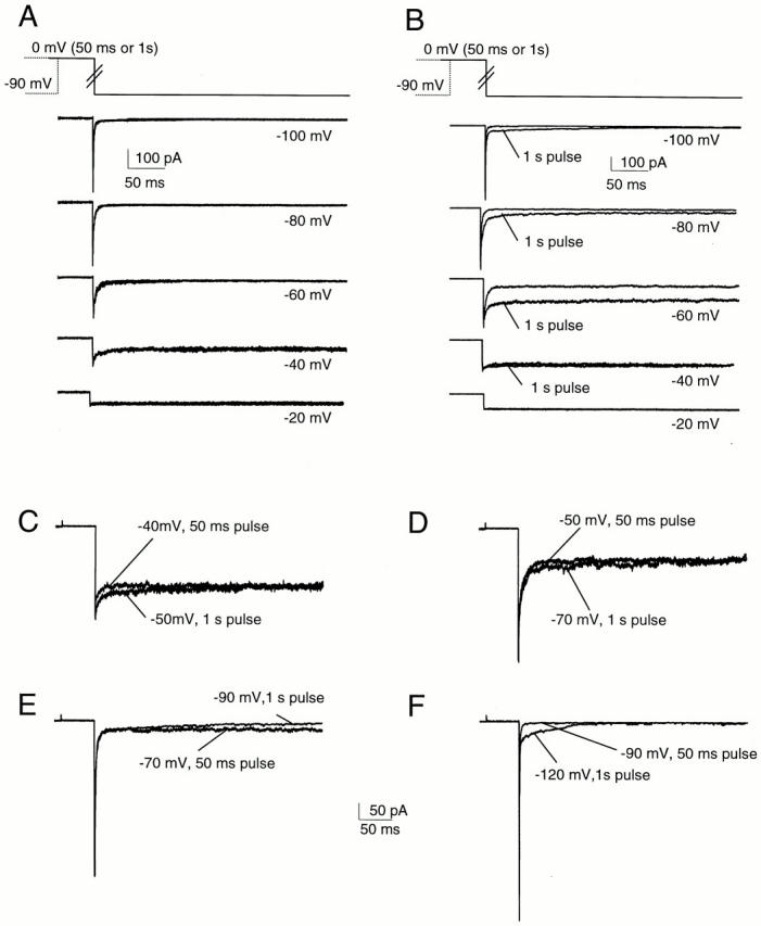 Figure 8. Tail currents during repolarizations at different potentials. Top panels show superimposed tail current records during repolarization to the indicated potentials, elicited after 50- or 1,000-ms pulse to 0 mV. In Sh-IR (A), the deactivation kinetics are practically identical after long (1,000 ms) or short (50 ms) depolarizations. (B) Same type of experiment as in A, but from an oocyte expressing Sh-IR-T449V-I470C. After 1,000-ms depolarizations to 0 mV, tail currents are significantly slower. (C–F) Sh-IR-T449V-I470C: superimposed deactivation tail currents at different repolarizing potentials after prepulses of 50 and 1,000 ms. Note that the voltage shift required to obtain similar time courses of deactivation tails after 50- and 1,000-ms pulses is not linear, but increases for more negative potentials. |