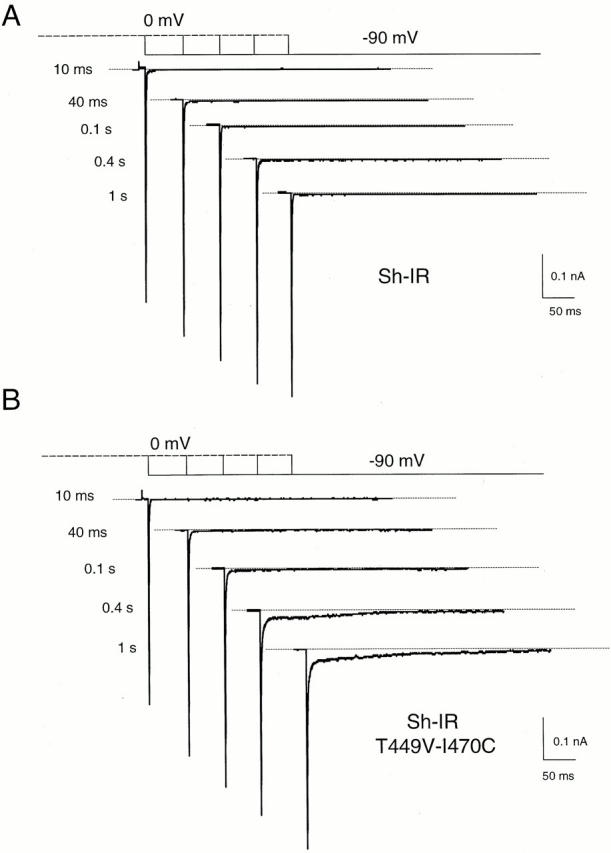 Figure 6. The deactivation rate of Sh-IR-T449V-I470C depends on the duration of depolarizations. The top panel shows K+ tail currents from an oocyte expressing Sh-IR during repolarization to −90 mV. The tail currents are recorded after depolarizations to 0 mV of increasing duration (the duration of the preceding pulse to 0 mV is shown next to the traces). Note that the duration of the conditioning depolarization does not affect the rate of deactivation. In the bottom panel, the same experiment as in A but from an oocyte expressing Sh-IR-T449V-I470C. The tail currents show the appearance of a slow component that progressively increases with pulse duration. |