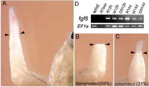 days after operation. (D) RTâPCR analysis of fgf8 expression. RNA samples were prepared from regenerating forelimbs (R), wound-healing
