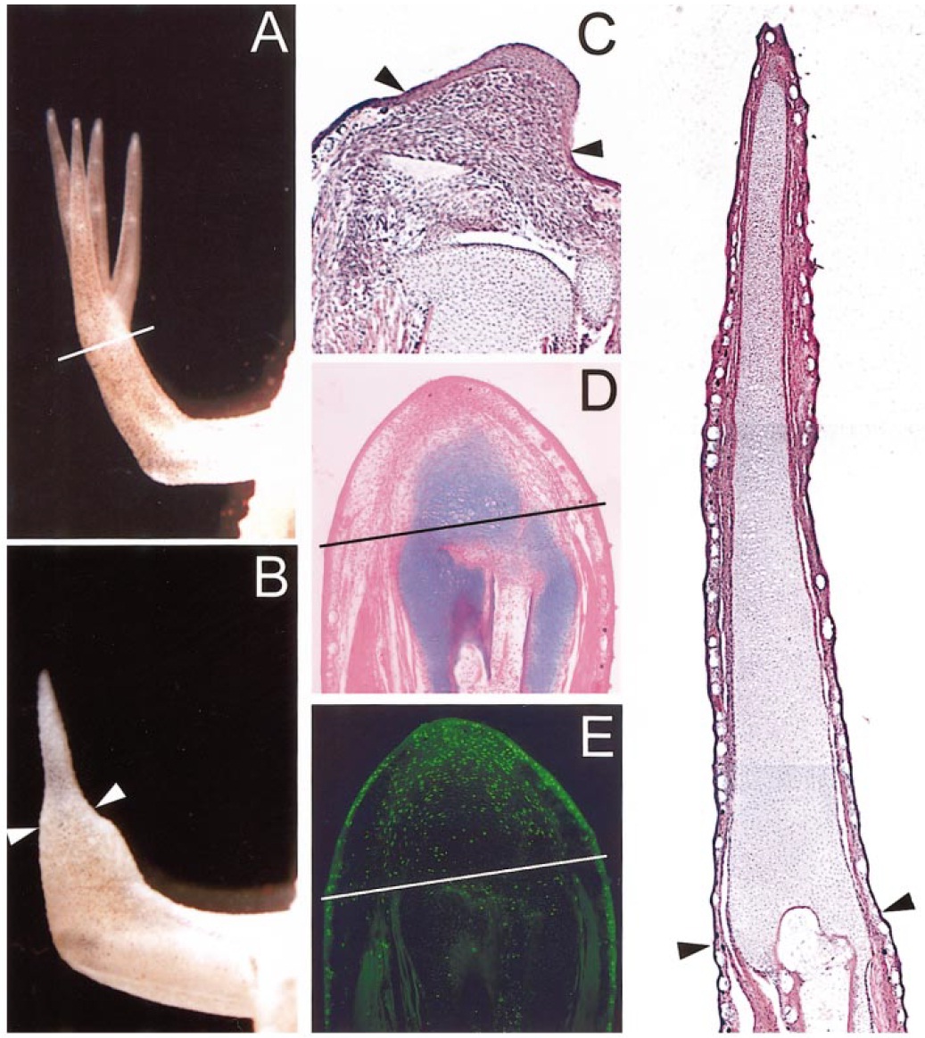 limb buds and blastemas. (B) Developing limb buds at stage 51 (B), stage 53 (C), and stage 55 (D). (E) Regenerating blastemas of the