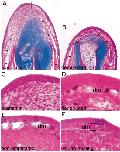 FIG. 6. Expression patterns of HoxA13, msx1, fgf8, and shh in blastemas formed on froglet forelimbs. (A, B) HoxA13. (C, D) Msx1. (E, F)