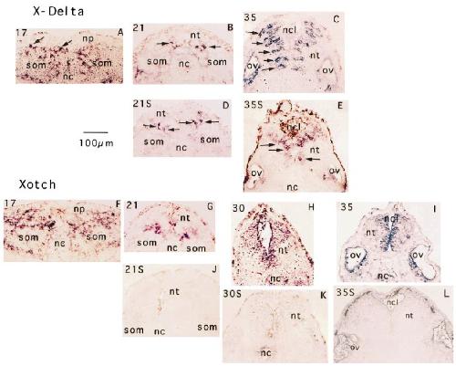 expressed elsewhere in the neural plate. Xotch, like X-Delta, is segmentally expressed in the somites and this section passes through a region of
