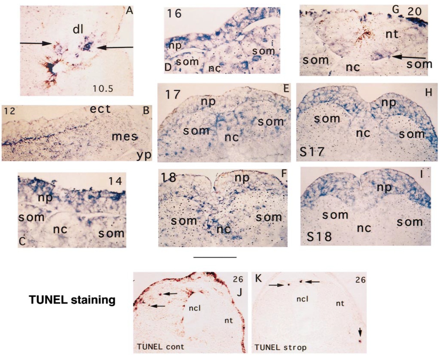 are present in the nervous system either dorsolaterally (J, control) or in the roof plate (K, strophanthidin treated). TUNEL-positive cells